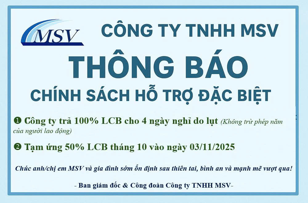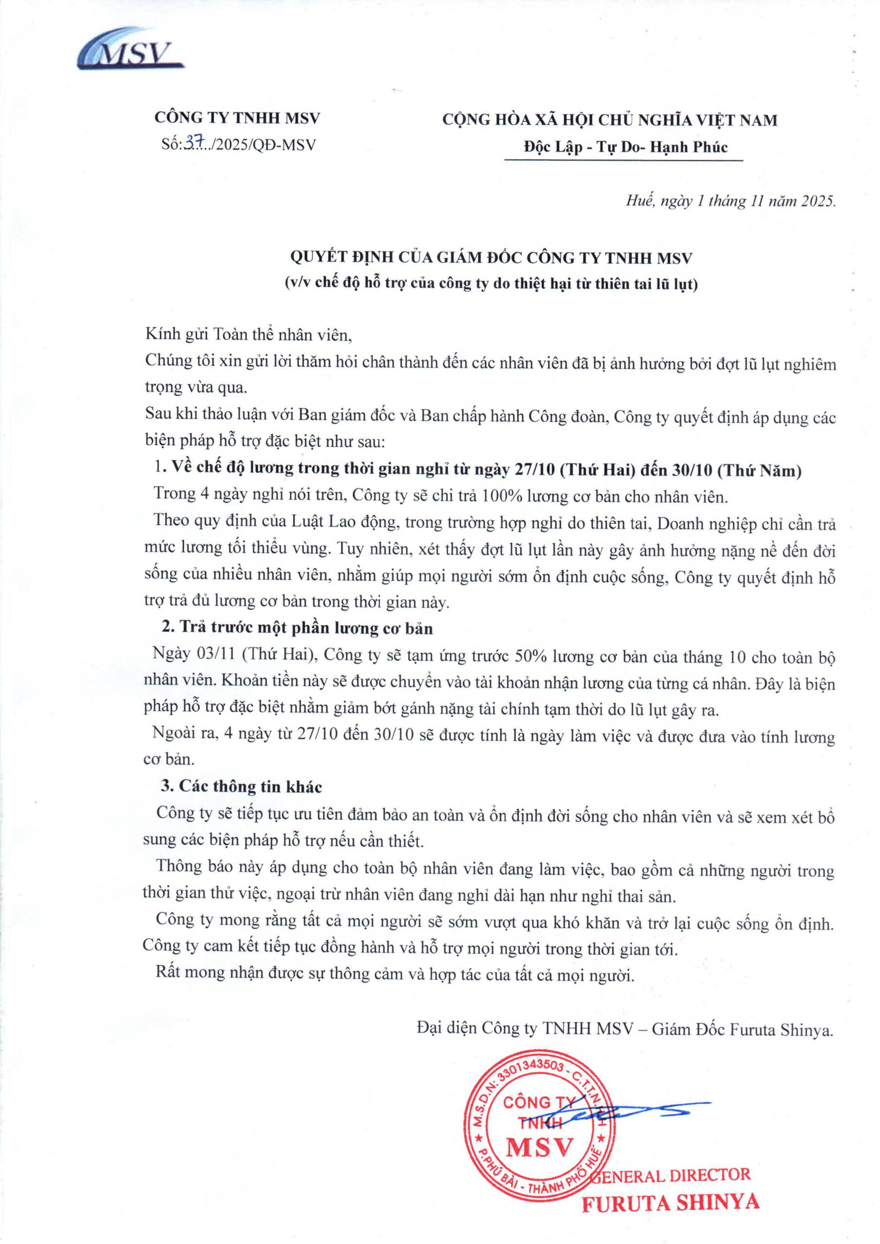 QUYẾT ĐỊNH CỦA GIÁM ĐỐC CÔNG TY TNHH MSV (v/v chế độ hỗ trợ của công ty do thiệt hại từ thiên tai lũ lụt)